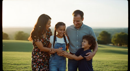 A family of four is embracing each other, radiating warmth and affection. The scene is bathed in golden sunlight during the sunset. The image displays a soft focus with warm colors and a shallow depth of field, suggesting a peaceful outdoor setting. This photograph could be used for various commercial or editorial purposes.