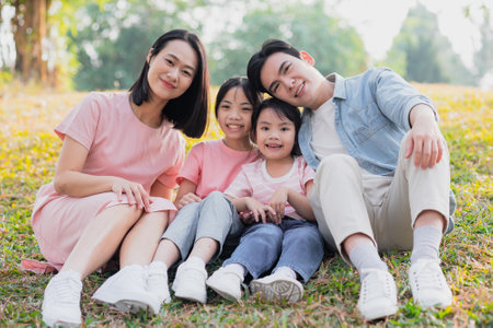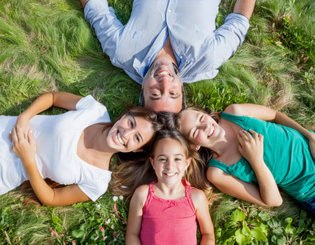 A family of four sits on soft grass in a park. They share joyful smiles while wearing casual, light-colored outfits. The sun shines down on them, creating a warm atmosphere.