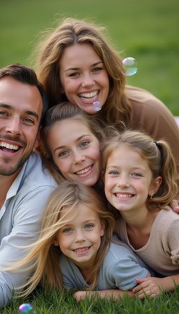 A cheerful family of five, including three young girls, is lying on a lush green lawn, surrounded by floating bubbles. Their radiant smiles and playful expressions capture the essence of happiness and togetherness, creating a heartwarming scene of love and joy.