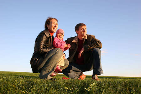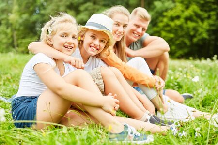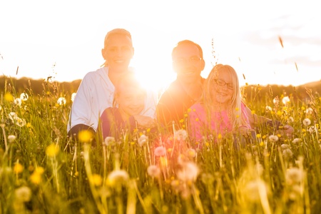 A family of four is gathered outdoors on a bright, sunny day, sitting on a blanket amidst tall green grass. A man and a woman are joined by their two children, one seated on the father's shoulders. The scene shows natural light and happy expressions, suitable for editorial or commercial applications.
