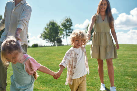 Cute little boy smiling at camera, holding hands together with his parents and sister and walking on green grass field in the park on a summer day