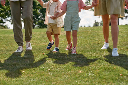 Cropped shot of legs of happy young family with two little kids holding hands, walking together in green summer park