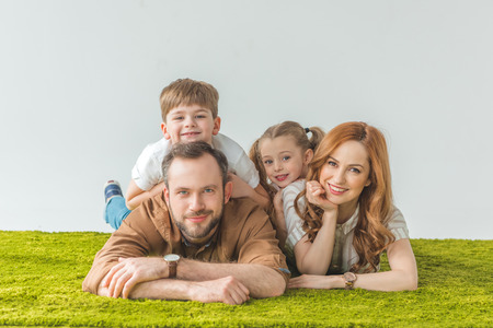cheerful family with two kids lying on lawn and smiling at camera on grey