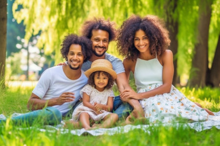 Generative AI : Cheerful happy family embracing and looking at camera while resting on green grass on sunny day in park