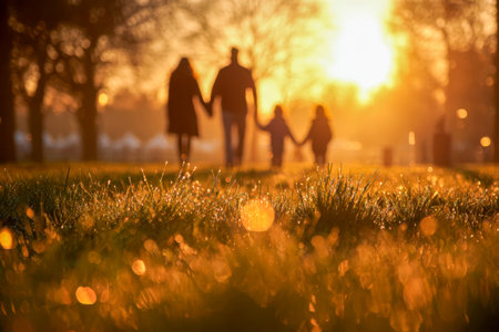 A family peacefully strolls together under warm, glowing sunlight, their figures cast as silhouettes against shimmering dewy grass, embracing the essence of unity an
