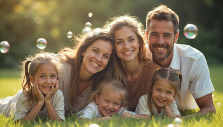 A cheerful family of five, including a man, three girls, and a woman, smiles brightly while lying on the grass, surrounded by floating bubbles. The image radiates happiness and warmth, capturing a moment of pure joy and togetherness in a sunny outdoor setting.