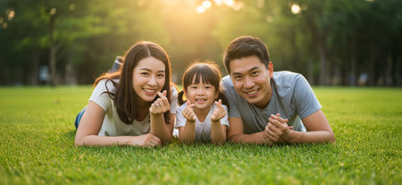 Smiling parents and child lying on green grass making heart hand gestures, enjoying a sunny day and expressing love and togetherness.
