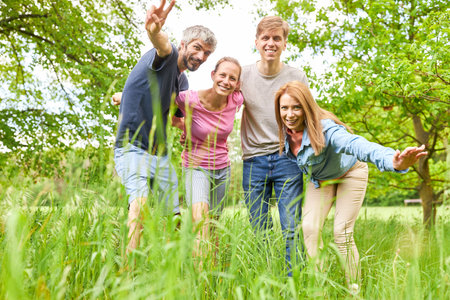 Happy, big family and garden of new home with love, support and grandparents with parents and kids. Backyard, smile and moving of mother, father and children together with bonding outdoor and field