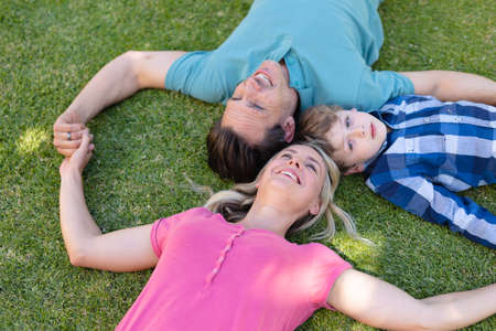 High angle view of smiling caucasian family holding hands and lying together in the garden. family, love and togetherness concept, unaltered.