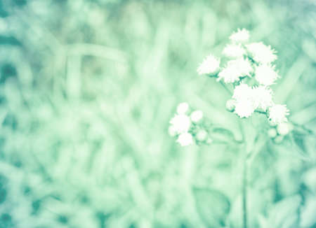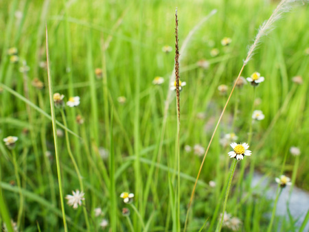 Selective focus Green grass and little white wild flowers meadow with soft style. Blossoming Tiny Wild White Flower Eriocaulaceae.