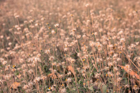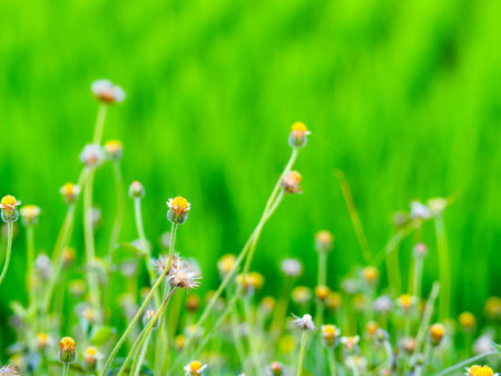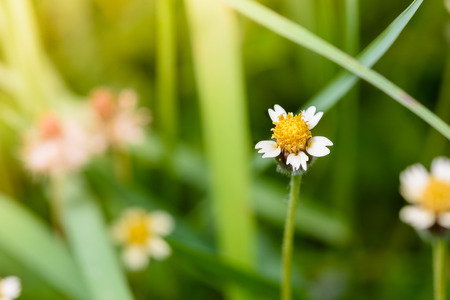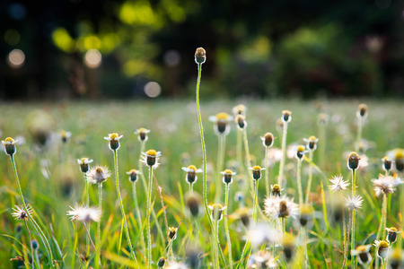Coat buttons, Mexican daisy, Tridax daisy, Wild Daisy flower blurry under morning sunlight , Close Up Macro