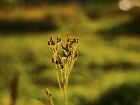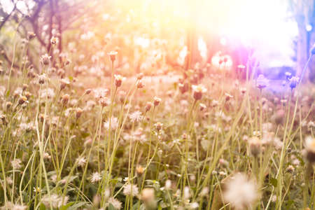 Close up of grass flowers on lawn in the evening and sunshine pattern for concept design. Grass flowers in the evening on field or lawn texture and background, vintage.