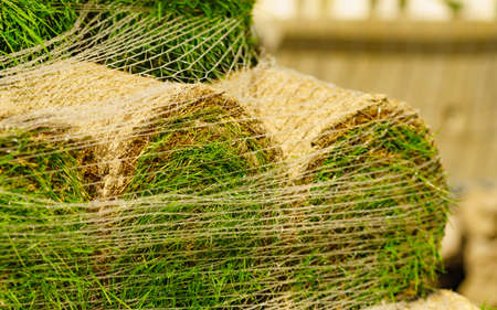 Lawn turf rolls stacked together, grass-plot in the rolls. Nature
