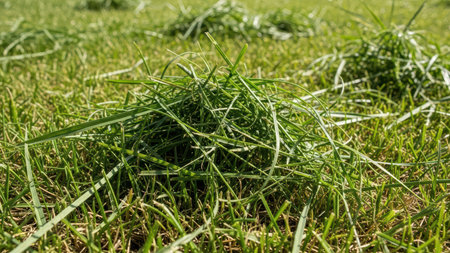 Freshly mowed grass clippings on a green lawn under bright sunlight.
