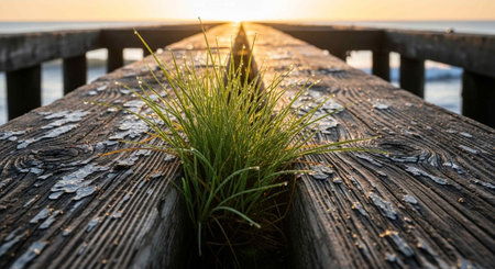 Close up of grass between planks
