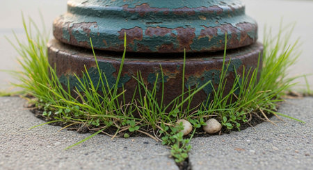 dry stump in cracks among green grass in a sunny garden.
