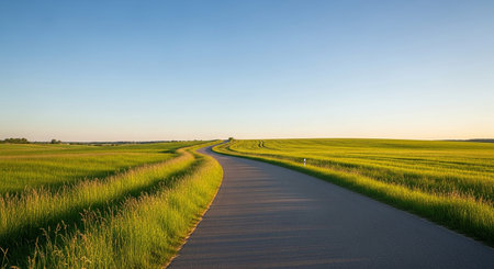 Stock showing winding asphalt road through lush green fields under a clear blue sky at golden hour. resolution use.