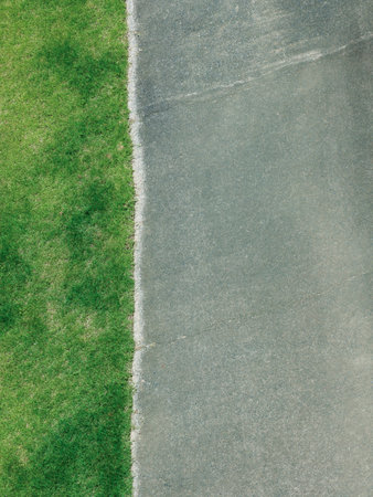 Green grass meets a weathered surface on a sports field, showing distinct textures and colors under bright sunlight. This highlights the beauty of outdoor sports environments.