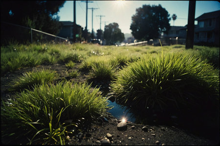A captivating close-up of the edge where lush grass meets a smooth asphalt surface, beautifully illuminated by soft sunlight, creating a serene urban scene.