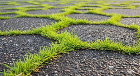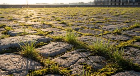 Generative AI : Green grass growing among the street setts