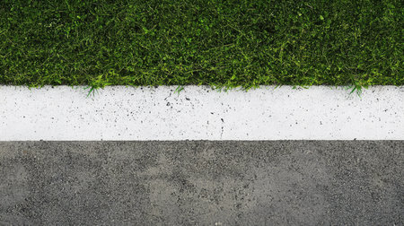 A fresh strip of vibrant green grass lines a smooth asphalt road, showcasing the beautiful contrast between natural elements and urban environments.