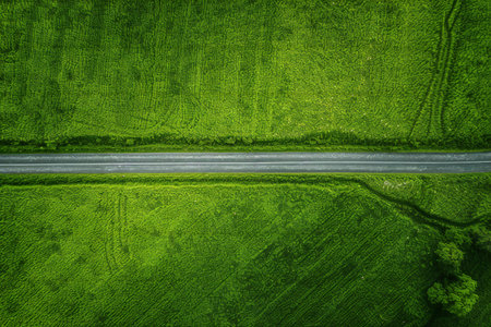 Aerial view of a rural road passing through a green field.