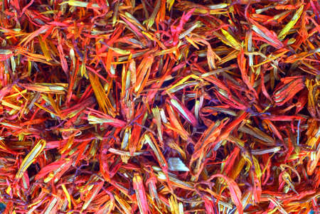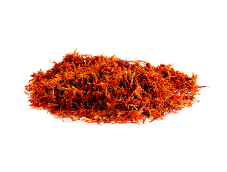 Dried safflower for herbal tea on white background, dry safflower petals, Saffron substitute