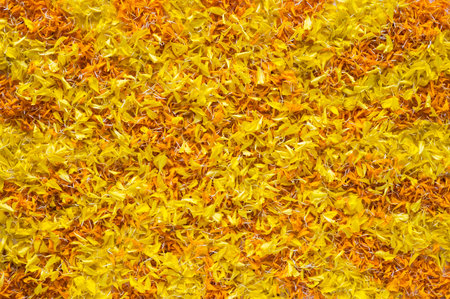 Yellow and orange marigold petal flower rangoli for Diwali festival background.