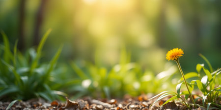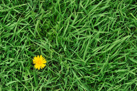 Floral background with fresh green grass and yellow dandelion in center