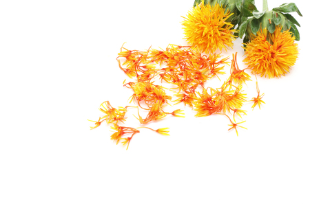 Safflower petals on white background