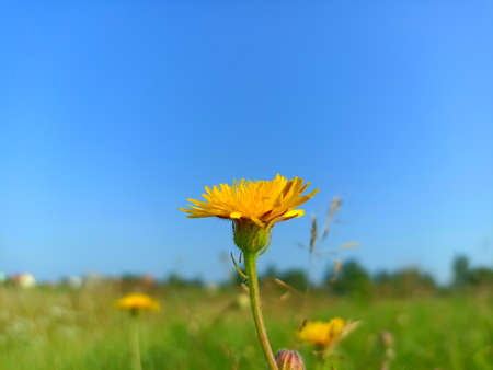 Yellow dandelion flower on a background of blue sky and green grass