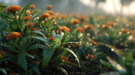 A panoramic wide view of Safflower garden growing closely together in a dewy morning shining droplets on leaves warm soft daylight ultra realistic photography cinematic wide composition lifelike natural scene
