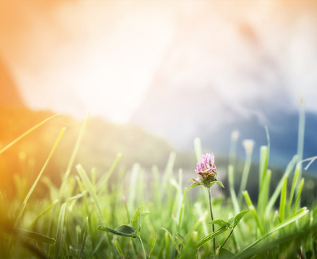 alpine meadow against mountains and sunlight sky