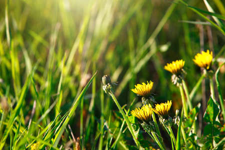 Group of yellow dandelions on green lawn. Small beautiful flowers in grass close up. Textured background of blowball in greenery.