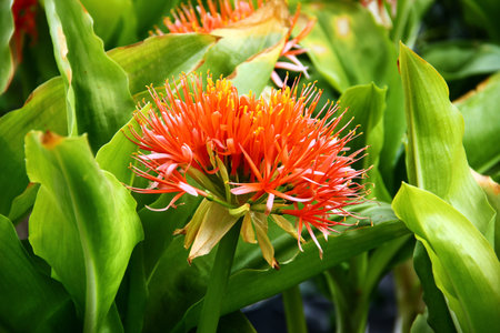 Blood lily blooming in vibrant orange among broad glossy green leaves