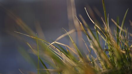 Close-up of grass by the sea in sunset light on a very blurred background