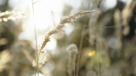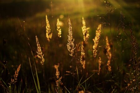Golden ears of grass are illuminated by the bright sunlight on a warm autumn evening. Nature is beautiful.