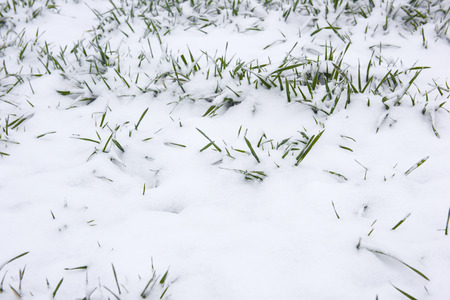 Sprouts of green winter wheat on a field covered with the first snow. Wheat field covered with snow in winter season