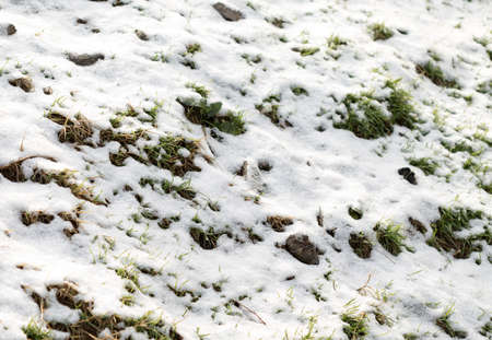 This image shows an abstract texture background of melting snow on a grass lawn in springtime.