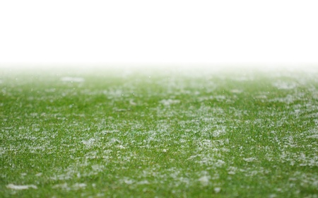 Snow on artifical football field with dots of milled rubber scales. Winter condition season in popular sport