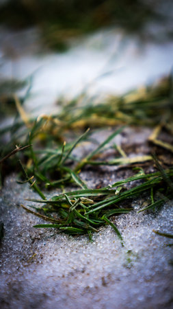 In a serene scene, vibrant green grass pushes through melting snow, signaling the arrival of spring. Nature awakens, blending colors beautifully in this tranquil moment.