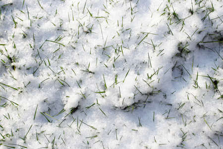 beginning of winter first snow background green yellow grass under snow place for text close-up