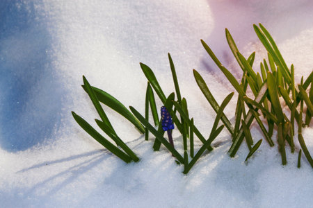 Tulips sprout from the ground through white snow in the chill of springtime. Tulip leaves are covered with frosty ice. Frozen fresh green leaves of a tulip.