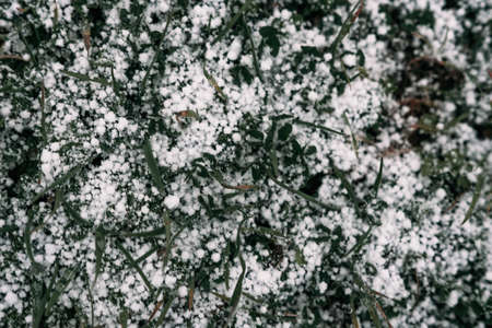 Selective focus. First snow on a frozen field plants, late autumn close-up. Beautiful abstract frozen microcosmos pattern. Freezing weather frost action in nature. Floral backdrop.