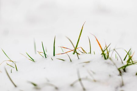 Green grass sprouts from under the snow. Snow close-up. Snowy Grass Macro.