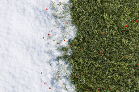 Melting snow reveals green grass and small red flowers, symbolizing the transition from winter to spring. 3d rendering
