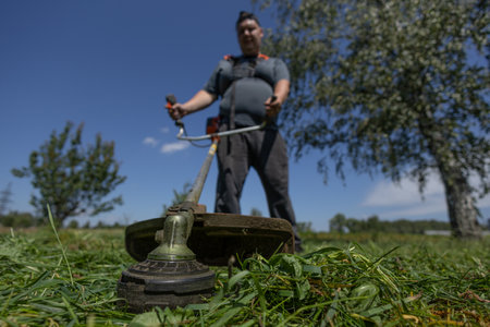 Worker mowing green grass with a trimming machine