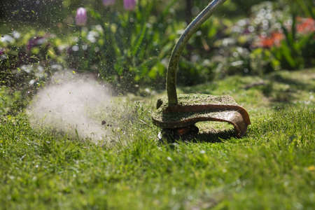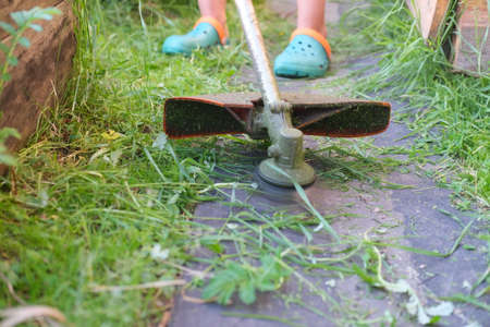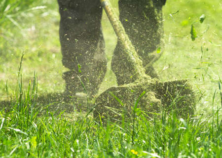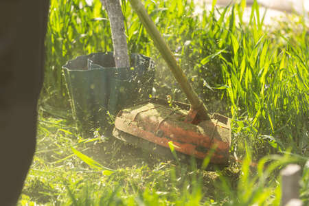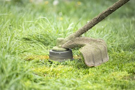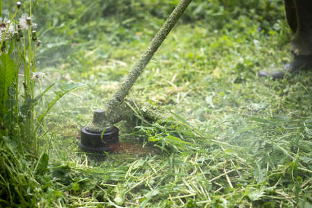 Mowing green grass using a fishing line trimmer. Application trimmers.