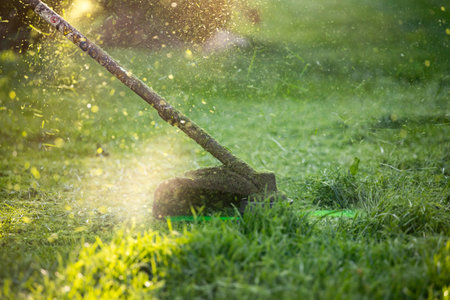 Cutting the grass with a professional handheld lawn mower