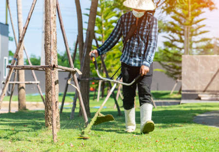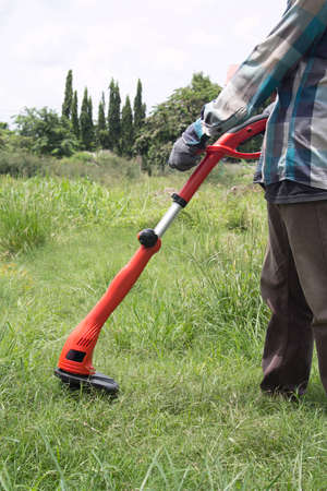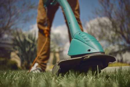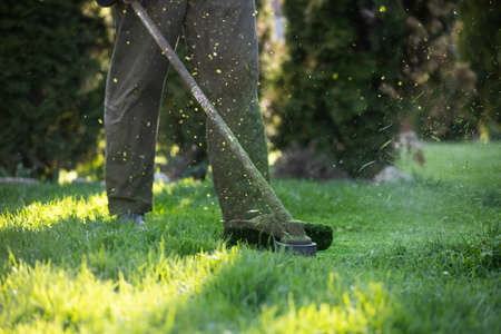 Gardener using a lawn trimmer mower cutting grass in the garden